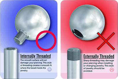 それに比べ、多くのジュエリー会社のインターナリースレッドはきれいに磨かれており、ピアッシングホールが傷つくのを最小限に抑えてくれます。